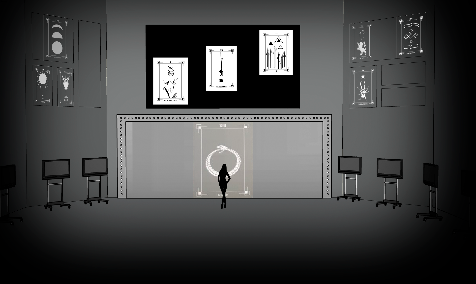 The presence of real reflective surfaces is not only as a scenic tool, but also a projection tool. The large mirror panel allows the characters to be dually presented, and projecting onto mirrors, especially in a dark space, can lead to the projection appearing on the ground while allowing parts of the image to remain on the mirror, which would be effective for Cleo’s moments of terror and attempt to ignore or escape from the world around her.