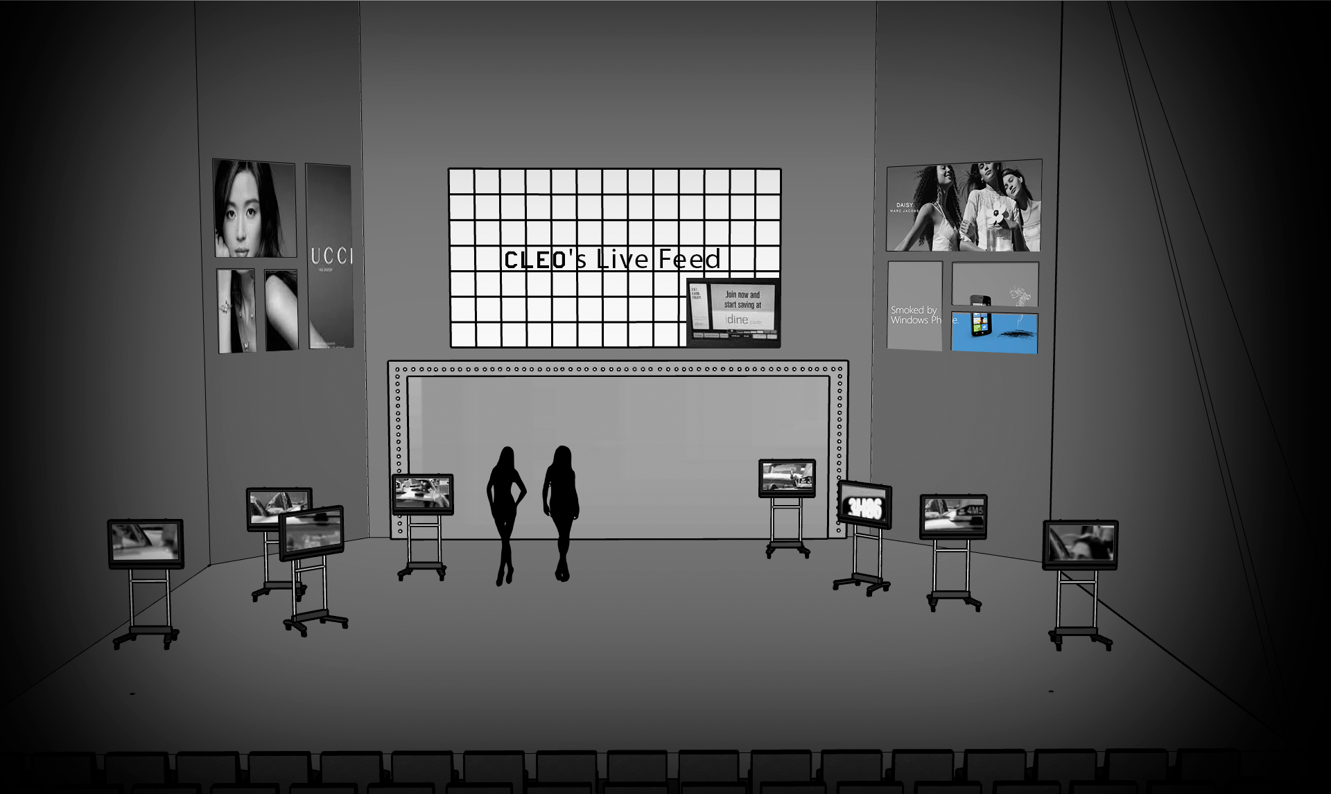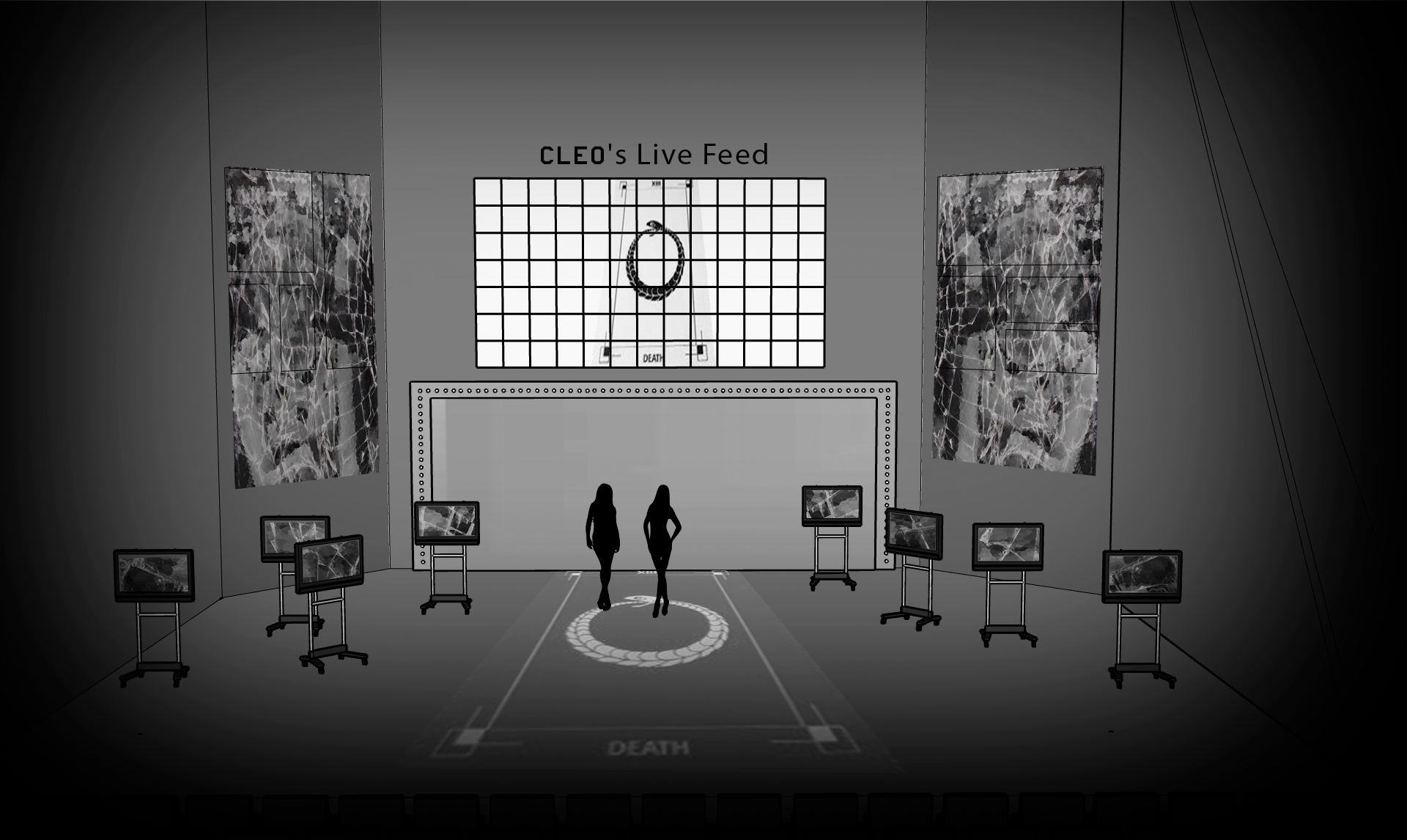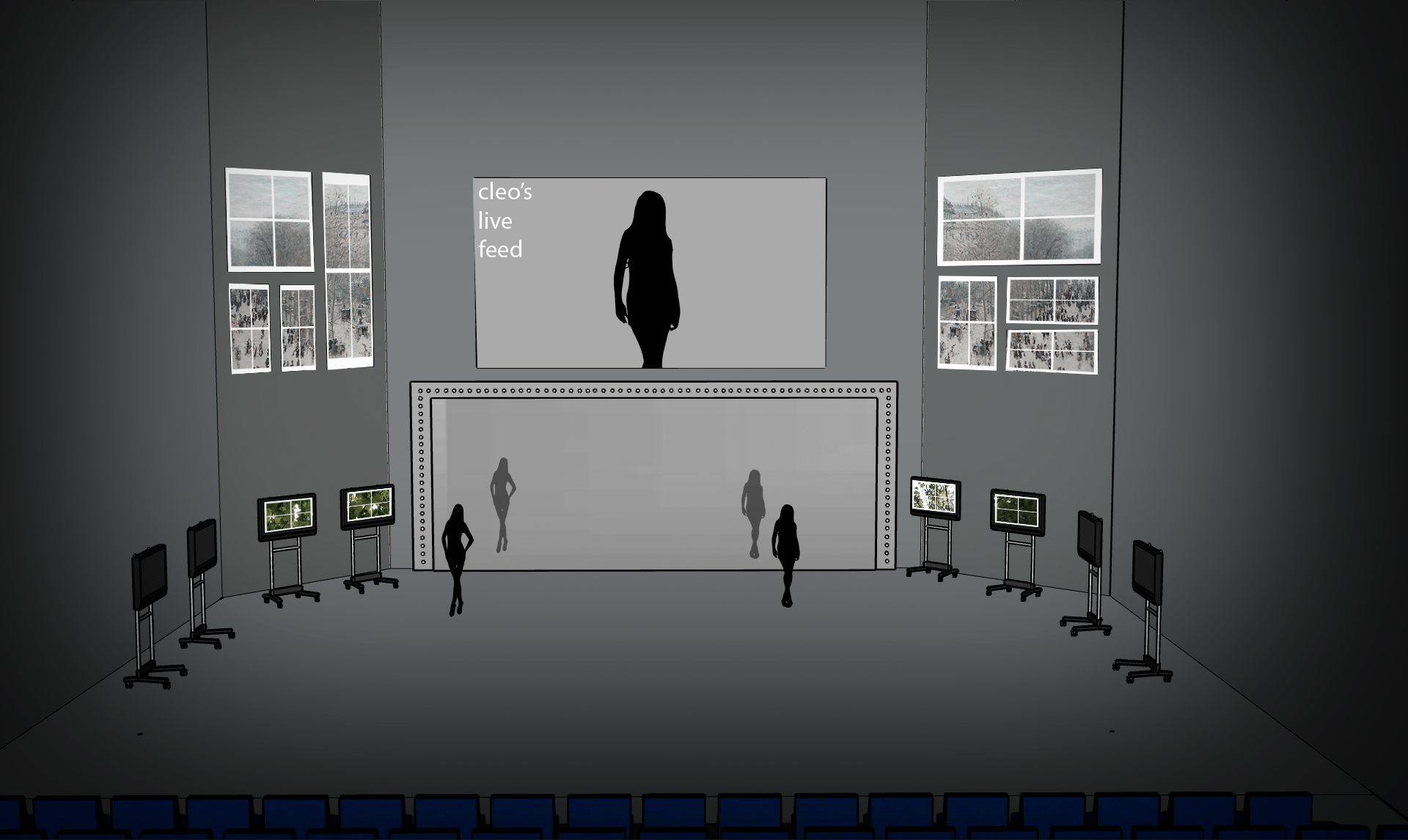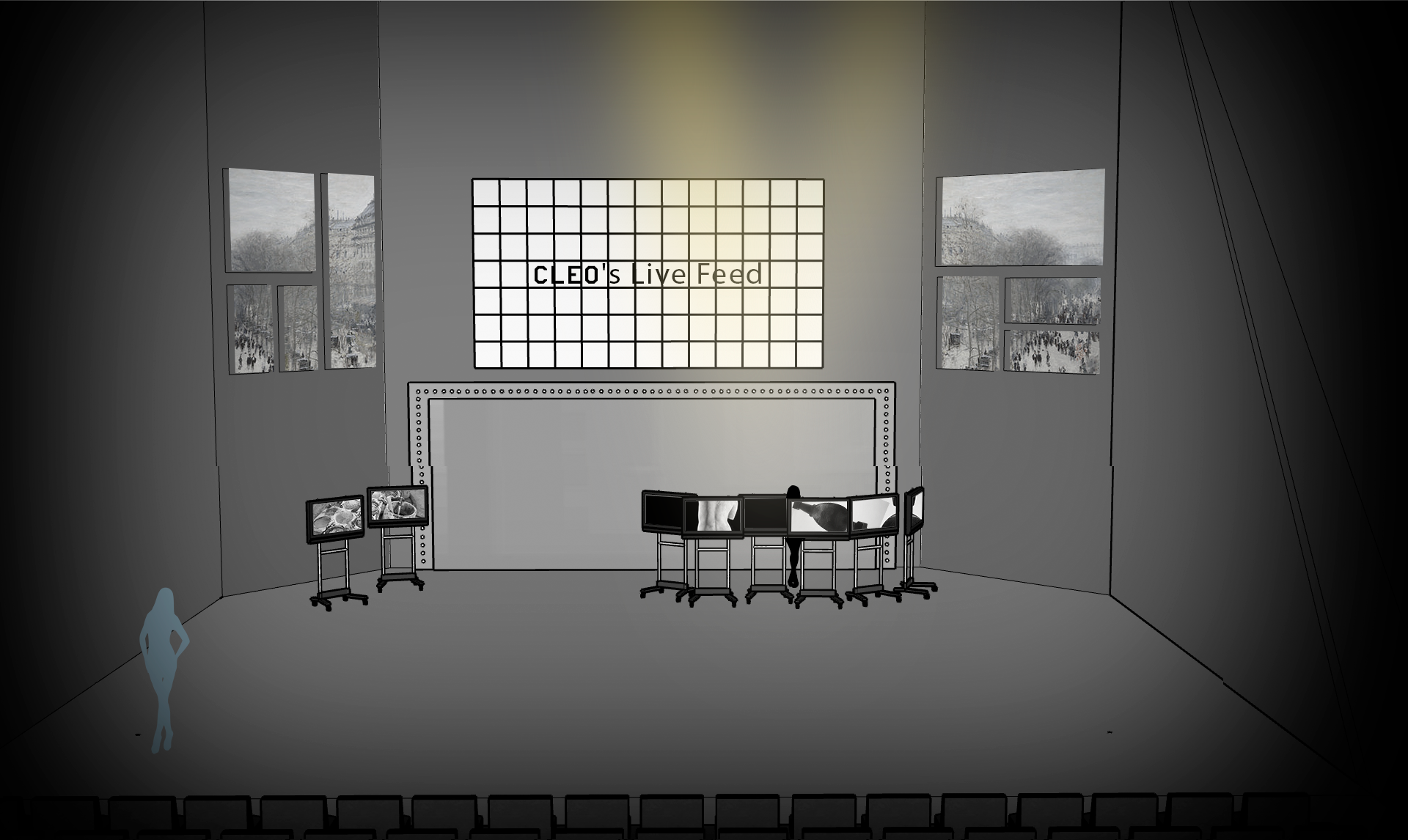 I would slowly colorize the set and the videos that accompany the play so that throughout it transitions from grayscale to color. This would mean the difficult task of draining the set and actors of as much color as we could at the beginning of the play, but this would parallel the transformation of Cleo from a scared, objectified beauty to a confident woman. It would provide a strong contrast between the light and dark onstage, thus providing emphasis for the themes of the piece. It would also help guide the audience’s gaze towards the color on the scene. This can be done through makeup, light temperature, and set design, as well as live video effects, with the video projection being completely black and white until moments where change would make sense.