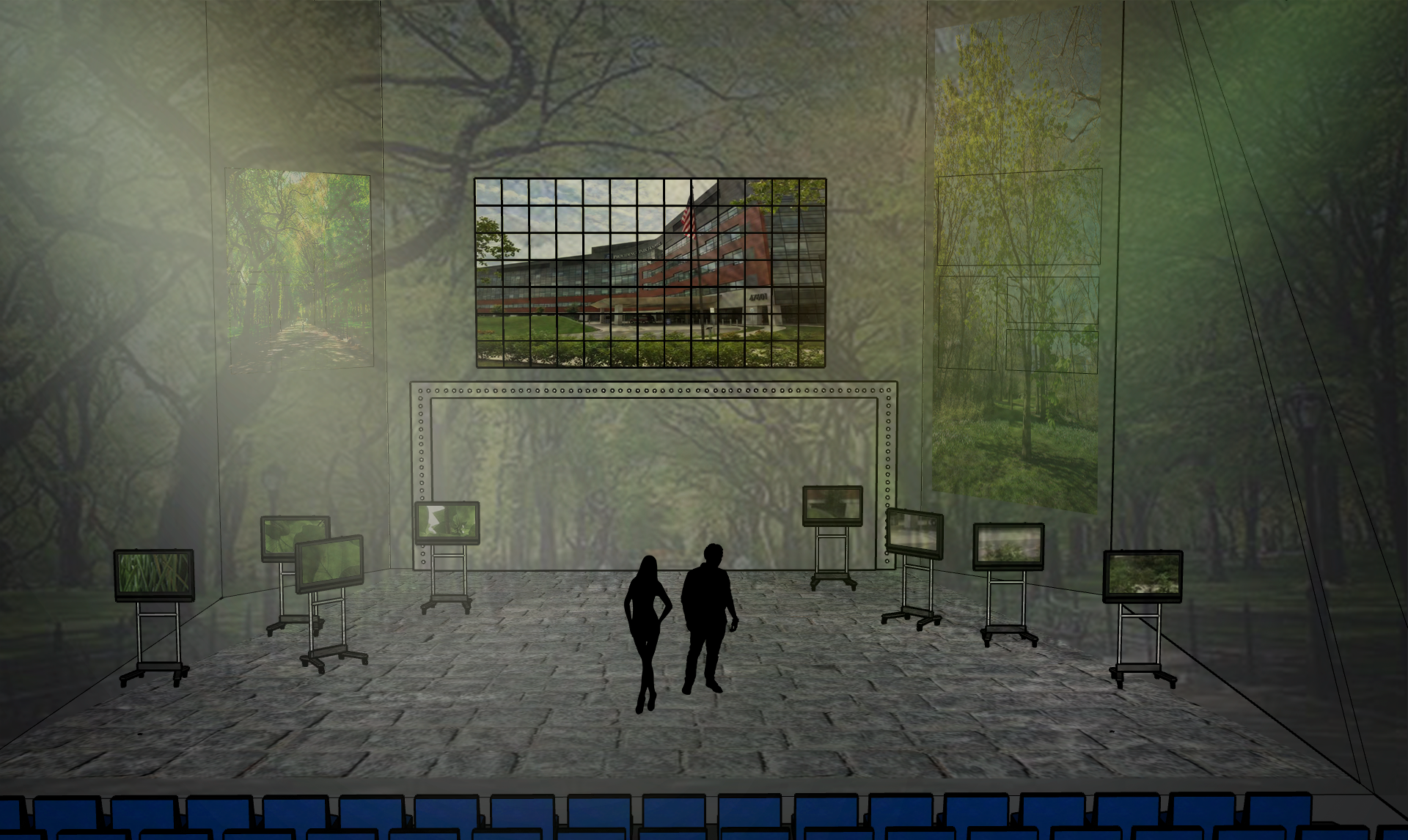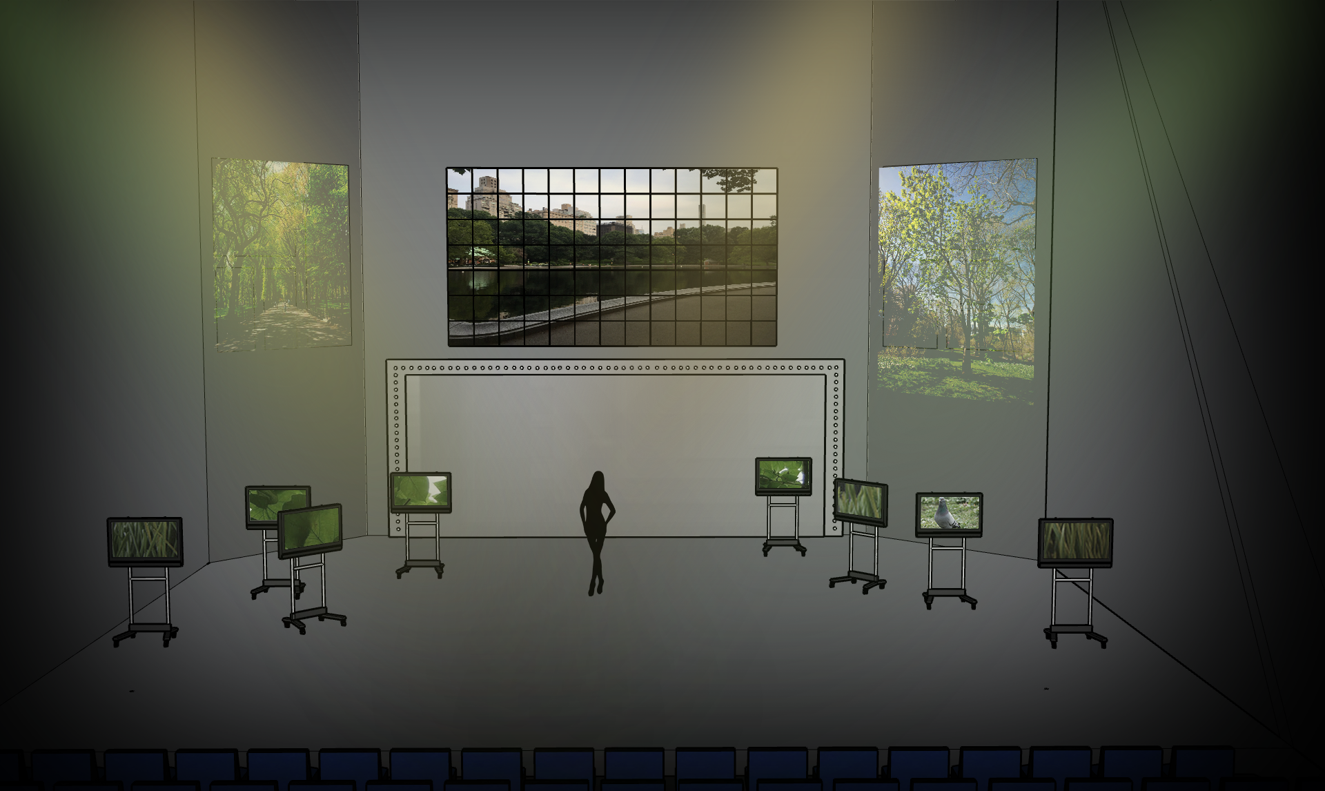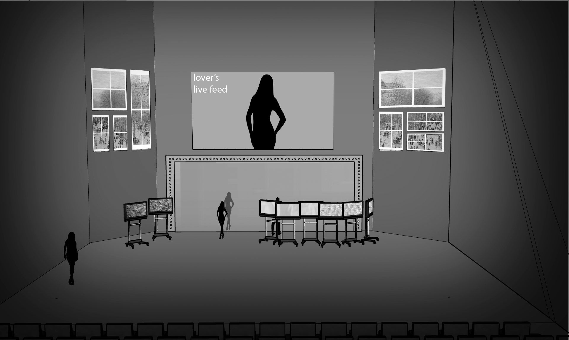 I think there is also possibility for the use of one-sided mirrors, allowing for reflection and transparency to be used at different points throughout the piece. However, I am inexperienced with the theory associated with them and would have to do some experiments.